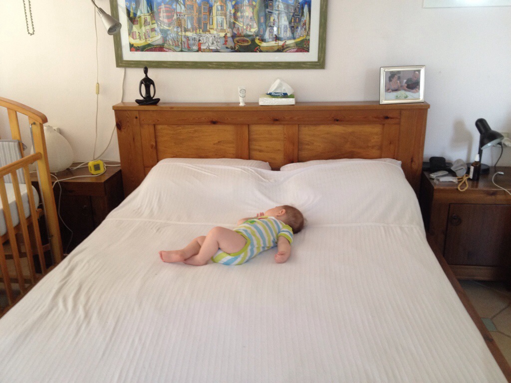 Over the past few weeks, Gadi has been going through some crazy leaps and bounds in his development – both motor and cognitive. When I’m not playing with him, doing the laundry, feeding or writing, I’m loving just watching him learn and explore. He does this adorable little skydiver move, on his tummy with his arms and legs out and up, he giggles and chats and dribbles. He reaches for toys and gets entranced by noises and colors. To my reading, this huge influx of sensory information is keeping him wired, making it more difficult for him to relax enough to get to sleep. And I totally get that; I know that when huge things have been going on for me – like covering massive news events in years gone by, for example – I’ve found it pretty hard to wind down and drift off to sleep.